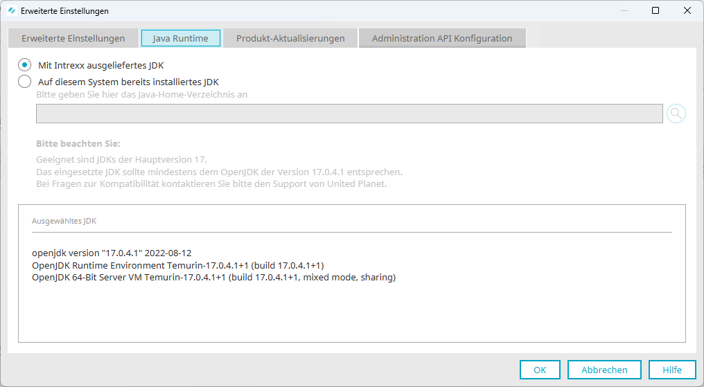 In den "Erweiterten Einstellungen" finden Sie auch die JavaRuntime (JDK), die im Lieferumfang von Intrexx enthalten ist.