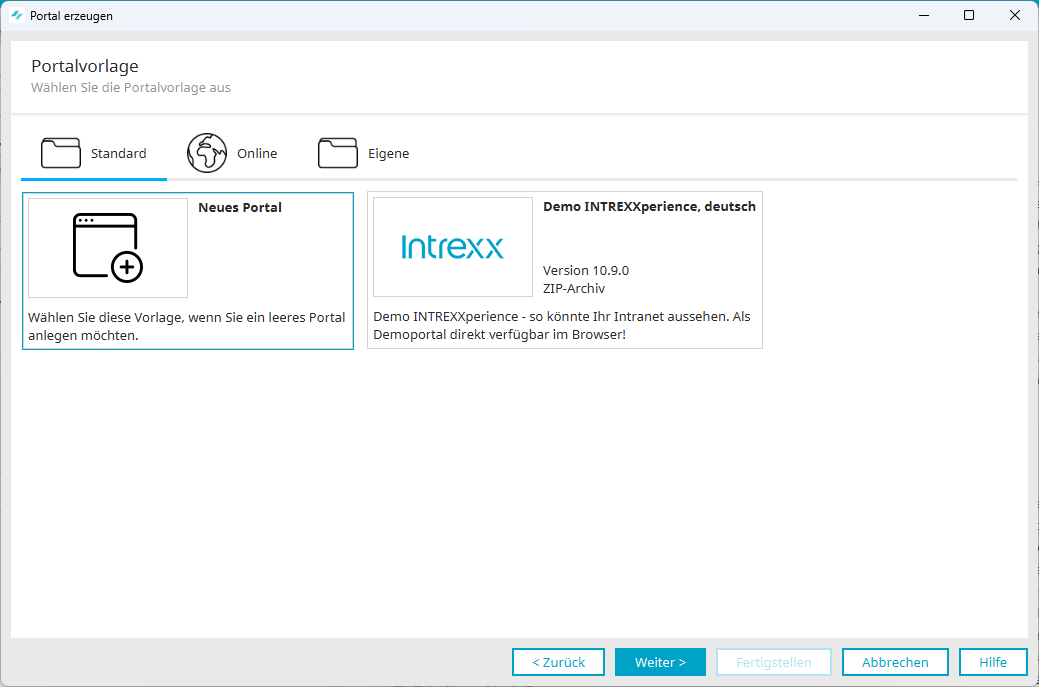 Ein Portal wird auf Basis einer Vorlage oder eines Portalexports erstellt.