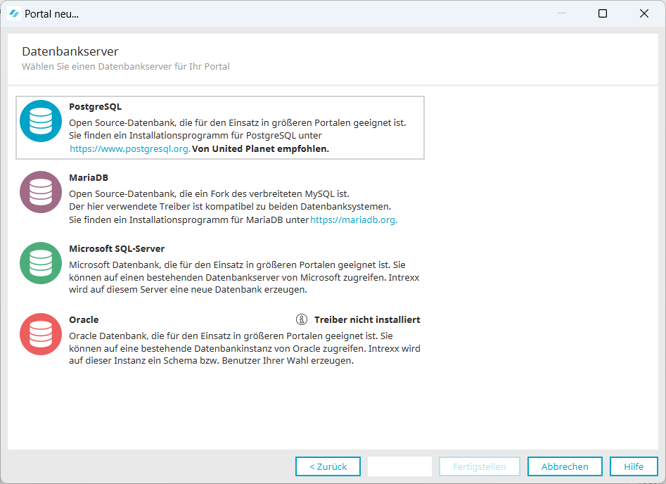 Als nächstes wird der Datenbankserver gewählt. Zur Verfügung stehen: