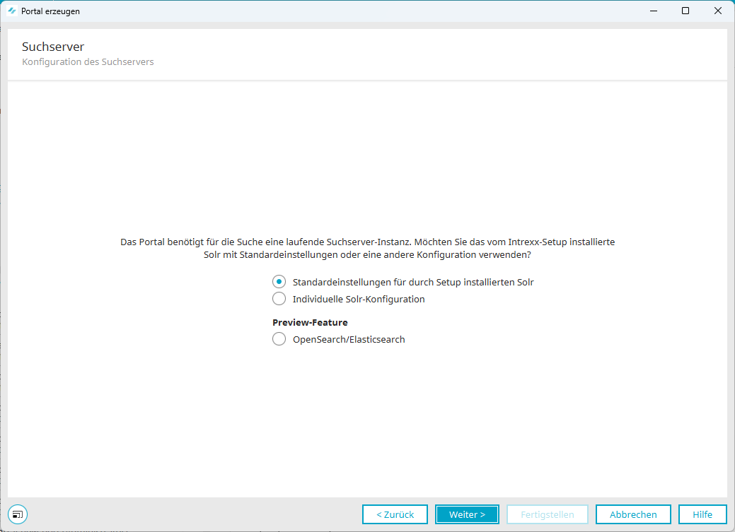 Hier haben Sie die Wahl zwischen der Standard-Konfiguration oder einer benutzerdefinierten Konfiguration des Solr Suchservers.