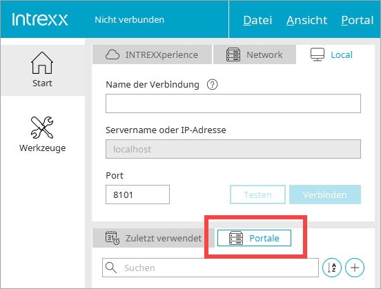 Im Tab "Portale" können Sie eine Liste ihrer Portale mit Namen, IP-Adresse und Port speichern. Klicken Sie auf das Plus-Symbol, um einen neuen Eintrag zu erstellen.