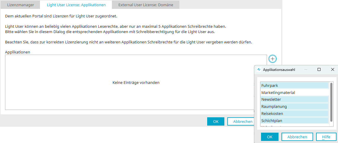 Light-User haben eingeschränkte Berechtigungen auf das Portal: Es können 5 Applikationen mit Schreibzugriff für die Light-User bereitgestellt werden. Die Konfiguration erfolgt direkt über den Portal Manager.