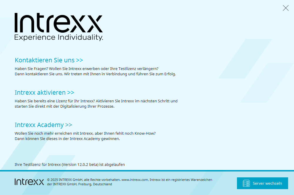 Je nach Intrexx-Lizenz haben Sie neben der Lizenz des produktiven Systems Anspruch auf eine Lizenz für Test- und / oder ein Entwicklungssystem.