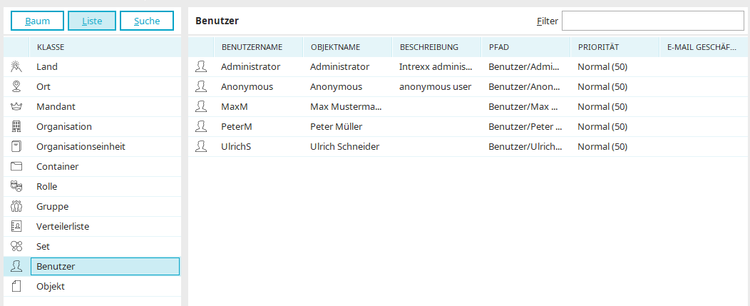 Die Listenansicht stellt alle Information nach der Objektklasse gruppiert dar. Wird eine Klasse selektiert, wird der Inhalt der Klasse angezeigt.