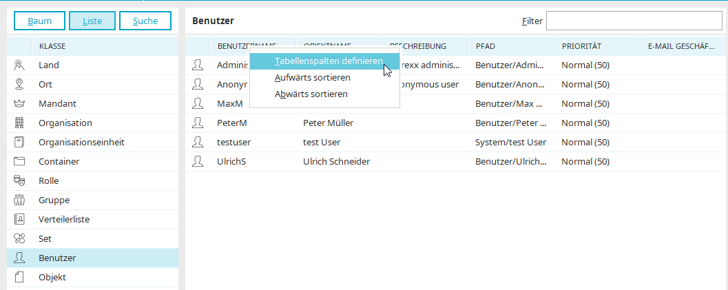 In der Listenansicht können die Tabellenspalten über das Kontextmenü des Tabellenkopfs individuell definiert werden. Eine auf- oder absteigende Sortierung kann aktiviert werden.