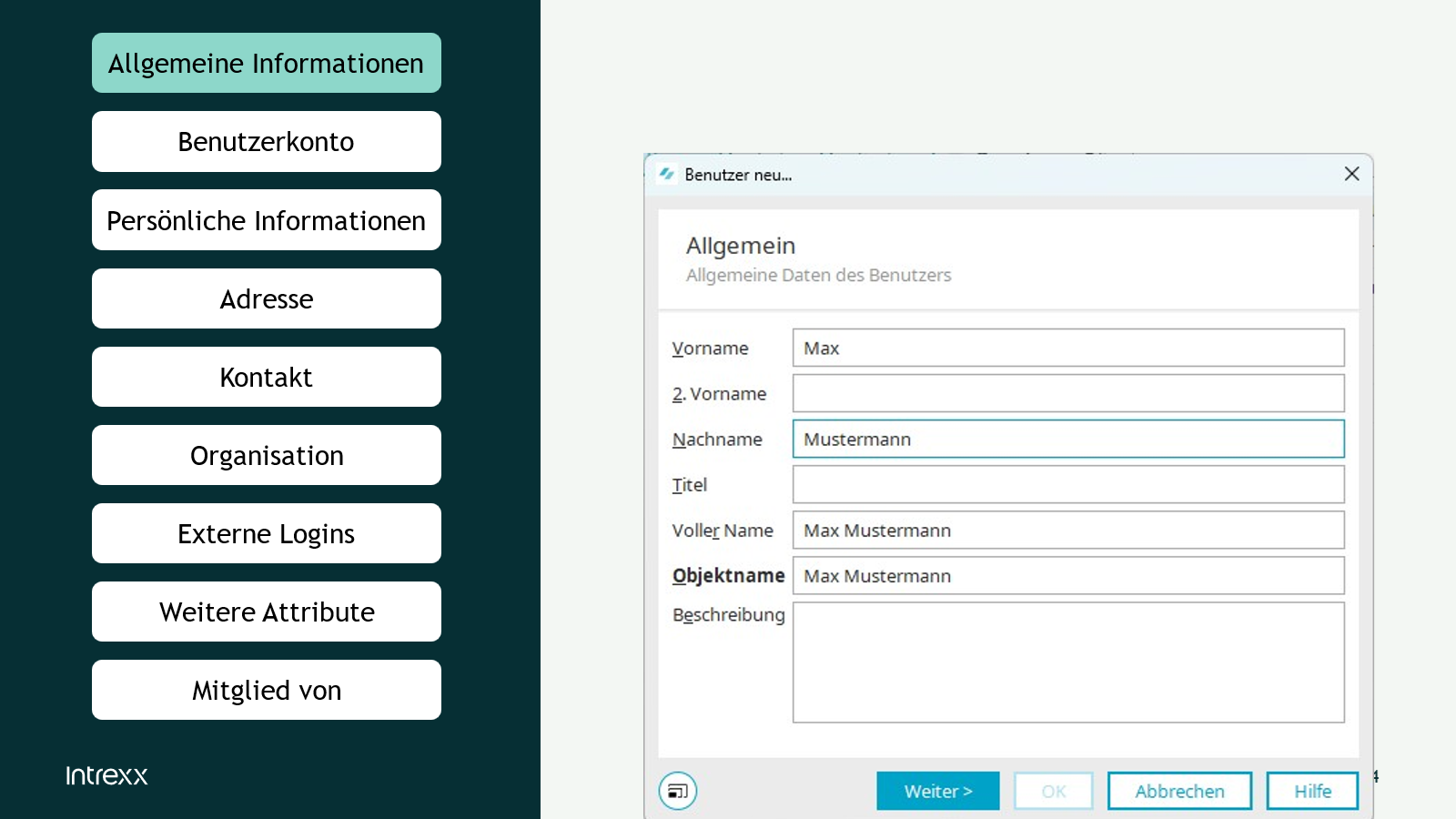 In den allgemeinen Informationen werden die Namen des Benutzers und des Objekts hinterlegt.