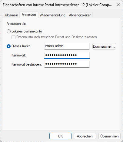 Ab sofort gelten die Zugriffsrechte der Domäne. Daher sollte der Intrexx-Portaldienst unbedingt in einem Domänenbenutzer-Kontext gestartet werden. Diese Einstellung kann in den Eigenschaften der Windows-Dienste vorgenommen werden.