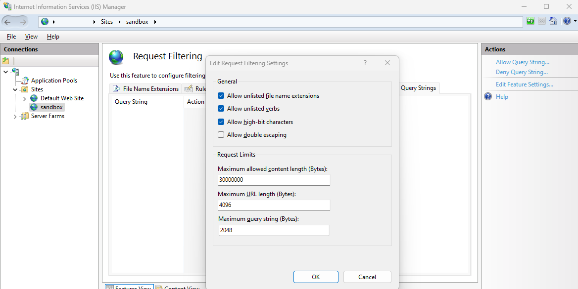 Das Standardlimit für einen Dateiupload liegt bei 30MB. Um dieses Limits zu ändern, muss man im IIS auf die jeweilige Webseite wechseln. Dort findet man den Punkt „Request“.