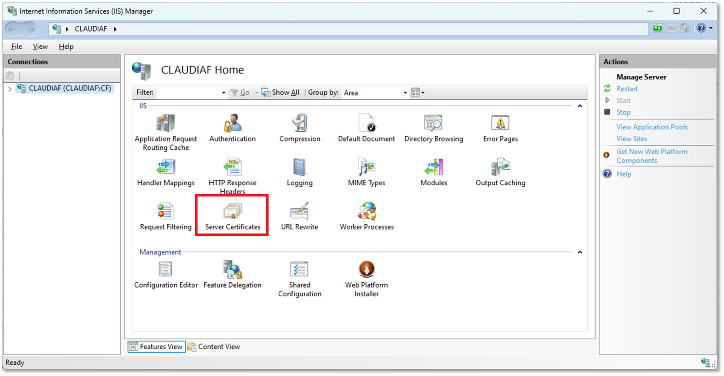 Starten Sie den Internet Information Service (IIS)-Manager und wechseln Sie auf die Server-Ebene. Dort finden Sie den Bereich für die Serverzertifikate.