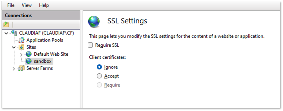 Da wir die Technik der Client-Authentifizierung via Client-Zertifikat nicht verwenden, reicht die Einstellung "Ignorieren" für Client-Zertifikate .