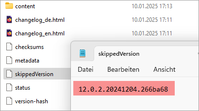 Haben Sie die Aktion "Version überspringen" gewählt und wollen die Version doch installieren, bearbeiten Sie bitte die folgende Datei: