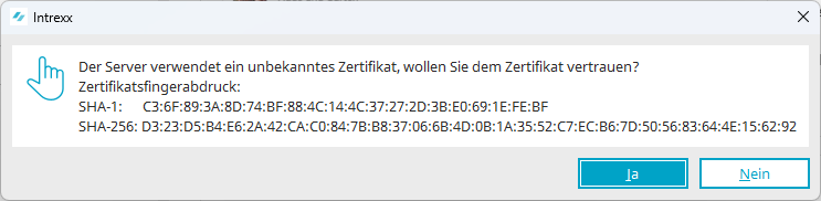 Um sich bei einem Portal anzumelden, muss dem Zertifikat des Servers vertraut werden. Ein Zertifikatsfingerabdruck kann angezeigt werden.