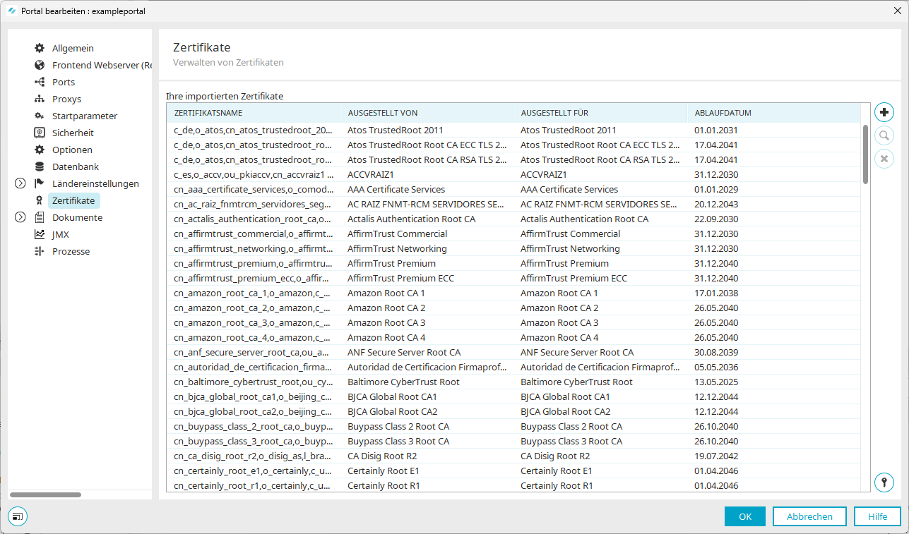 In den Portaleigenschaften (Menü "Portal / Portaleigenschaften / Zertifikate") können Zertifikate verwaltet werden.