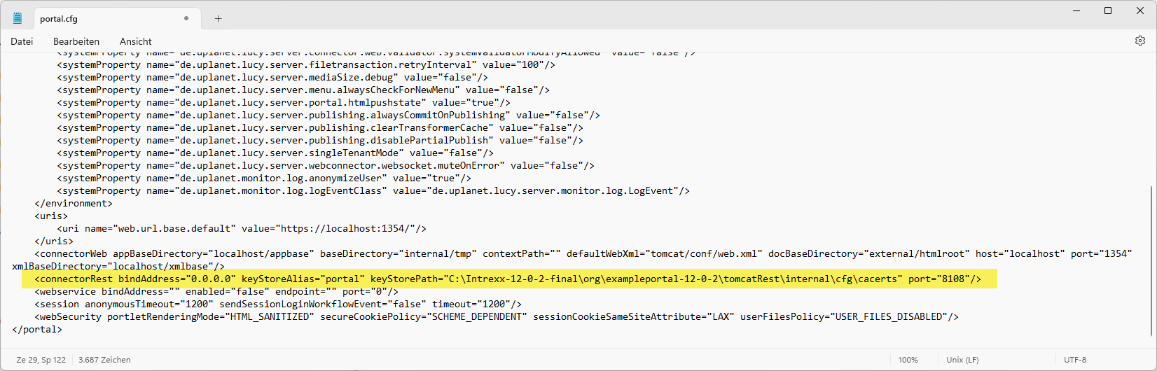 <connectorRest bindAddress="0.0.0.0" keyStoreAlias="portal" keyStorePath="C:\Intrexx-12-0-2-final\org\exampleportal-12-0-2\tomcatRest\internal\cfg\cacerts" port="8108"/>