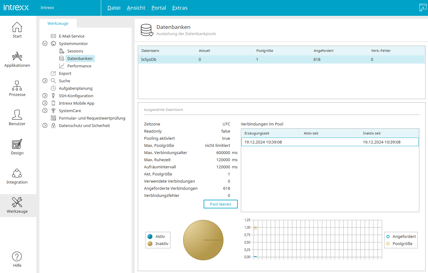 Alle aktiven Connections mit Anzahl der Anfragen seit Portal-Start sowie die Anzahl der Verbindungsfehler werden angezeigt. Im unteren Bereich werden alle Informationen zur ausgewählten Datenbank angezeigt.