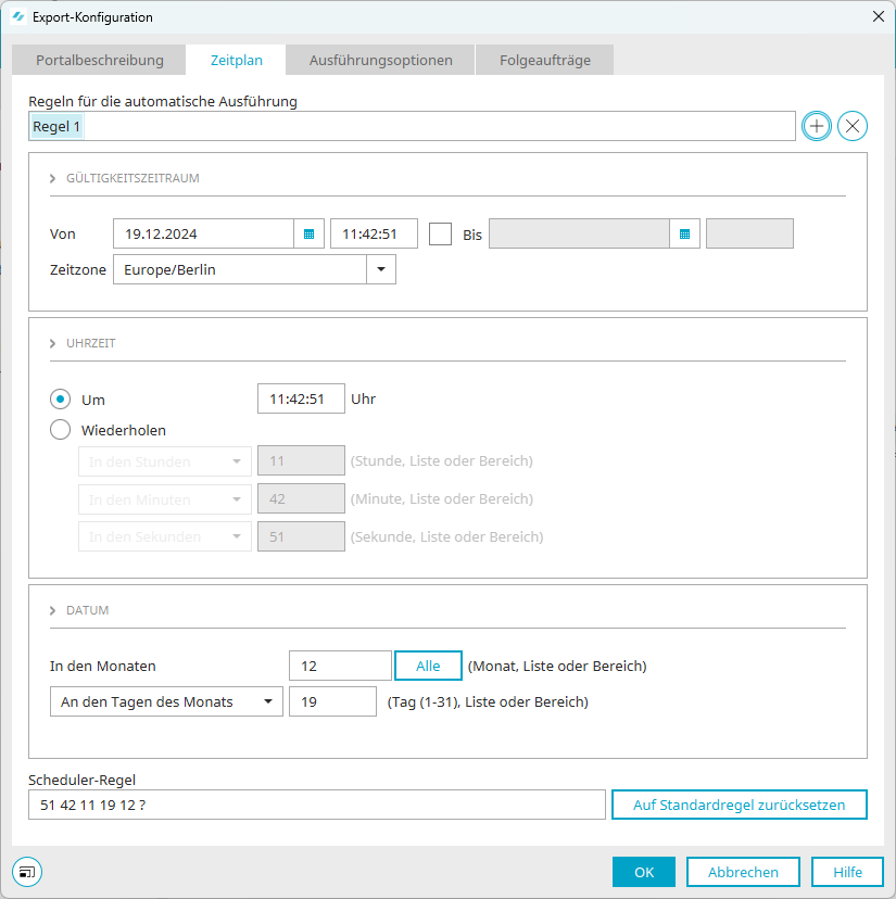 Um eine Einschränkung des Produktivbetriebs zu vermeiden, sollten Sie für den automatisierten Portal-Export einen Zeitrahmen außerhalb der regulären Arbeitszeit definieren. Beachten Sie, dass während des Exports keine weiteren Backupmechanismen parallel laufen, die das System oder die Datenbank herunterfahren. Der Portalexport schlägt sonst fehl.