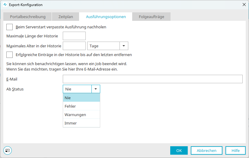 Beim Beenden des Jobs kann an eine hinterlegte E-Mail-Adresse eine Info geschickt werden. Definieren Sie einen Statuswert, bei dem die E-Mail geschickt werden soll. Folgende Statuswerte stehen dabei zur Verfügung: