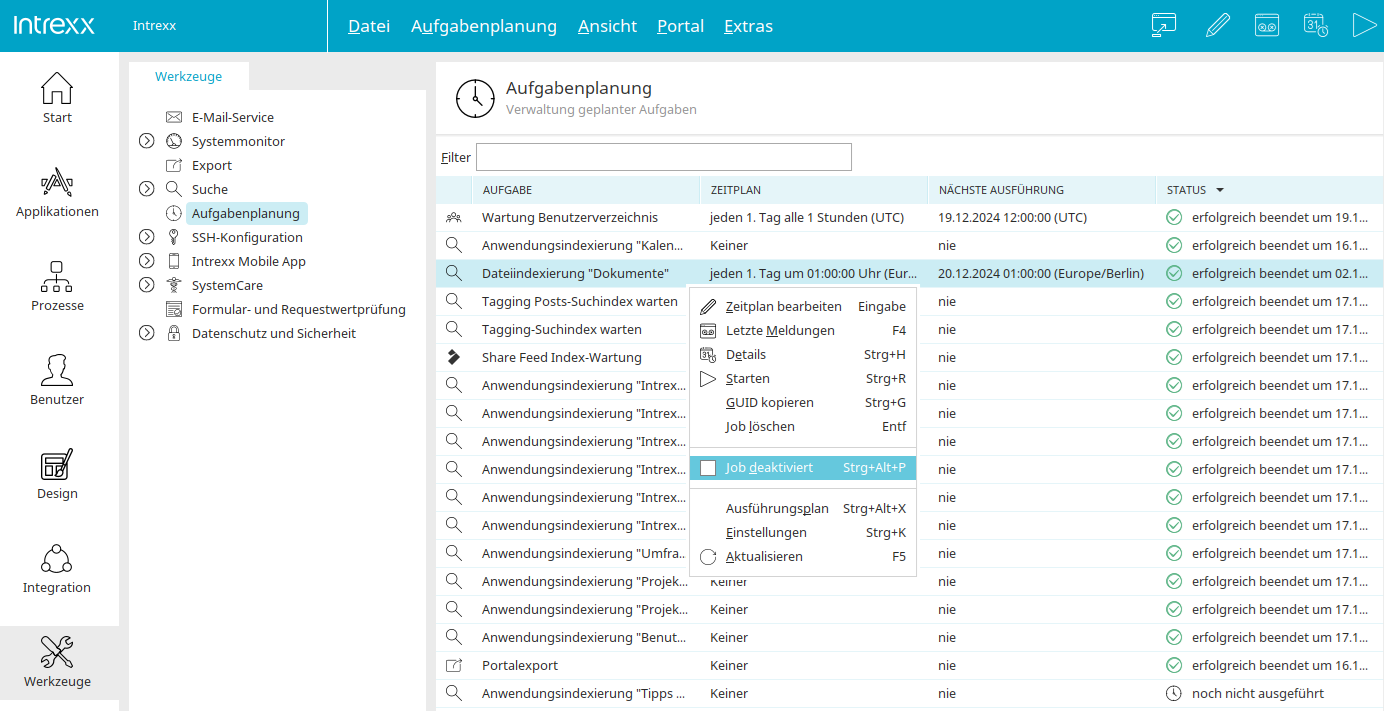 Über die Aufgabenplanung erhält man Einsicht in alle automatisierten und zeitgesteuerten Prozesse in Intrexx.