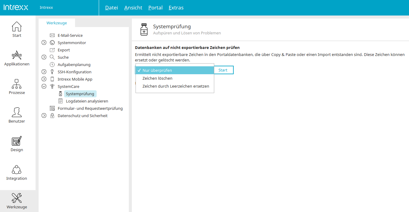 In der Systemprüfung kann die Datenbank auf nicht exportierbare Zeichen geprüft werden.