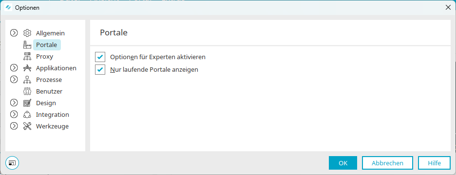 Die Voraussetzung für die Aktivierung der JConsole ist die Aktivierung der Einstellung "Optionen für Experten aktivieren". Diese Einstellung ist in den Optionen des Portals zu finden.