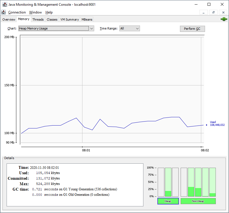 Die Memory-Übersicht zeigt die Auslastung des Arbeitsspeichers. Über die gesamte Zeit sollte sich hier ein Sägezahnmuster ergeben. Wird der Speicher verwendet, steigt die Kurve an. Sobald der Garbage Collector läuft, sollte die Kurve wieder abfallen.