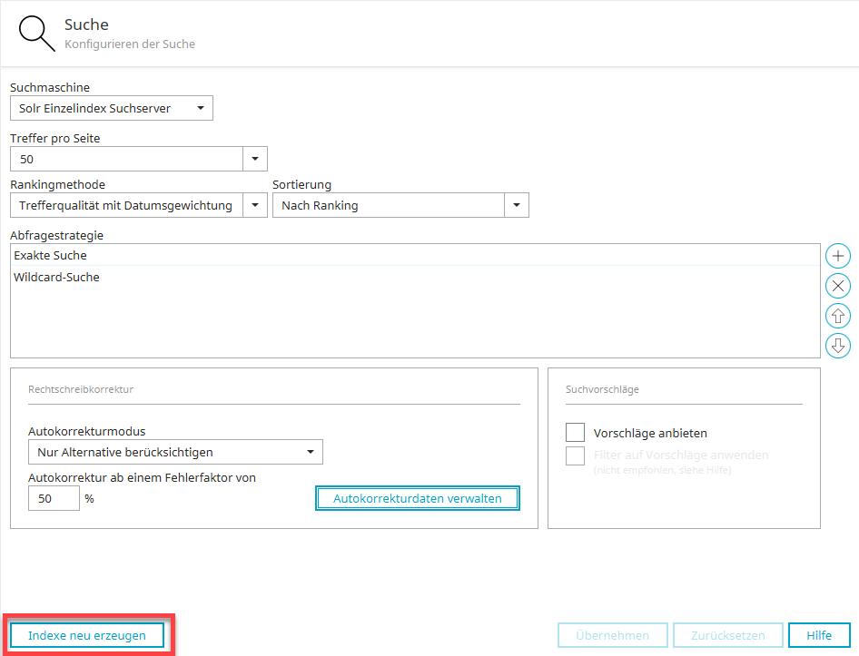Über die Schalfläche "Indexe neu erzeugen" werden die Indexe des Portals neu aufgebaut. Nach einer Sicherheitsabfrage startet die Indexerzeugung.