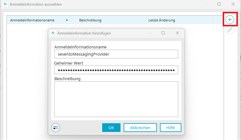 Über das Plus-Symbol können Sie hier einen neuen Eintrag mit der API ihres SMS-Anbieters hinzuzufügen. Vergeben Sie dabei einen eindeutigen Namen und hinterlegen Sie im Feld "Geheimer Wert" den API-Key des Anbieters. Hinterlegen Sie eine Beschreibung.