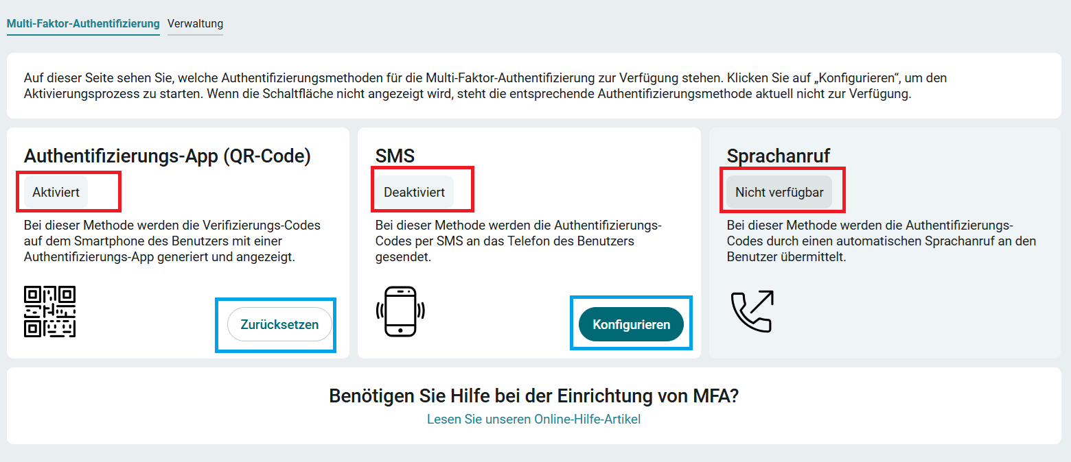 Unter jeder Authentifizierungsmethode wird der Status angezeigt: