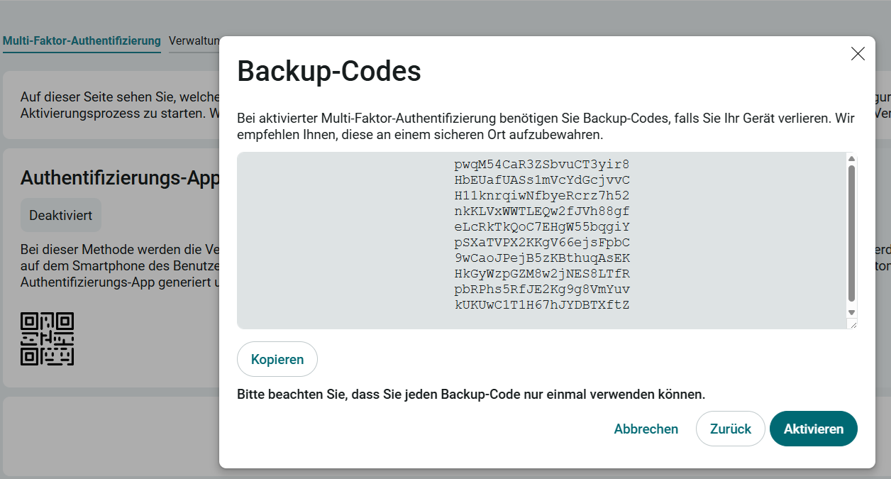 Im letzten Schritt werden die Backup-Codes angezeigt. Für den Fall, dass das Gerät verloren geht, können Sie auf diese Codes zurückgreifen. Bewahren Sie die Backup-Codes an einem sicheren Ort auf – zum Beispiel in einem Passwortsafe.