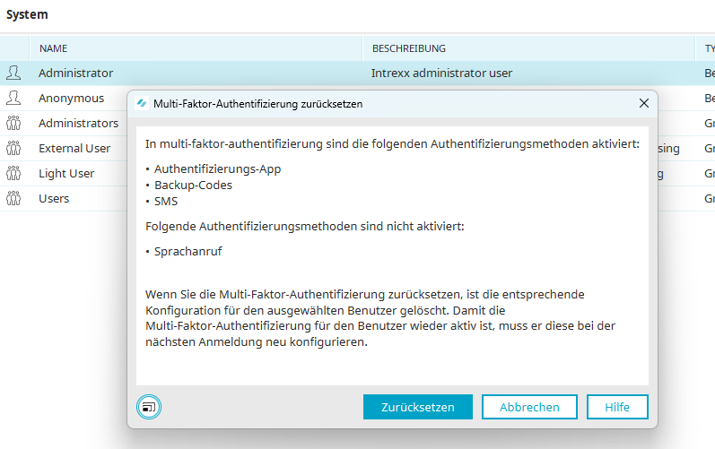 Wurde der Eintrag gewählt, so werden in einem Dialog alle aktivierten Authentifizierungsmethoden angezeigt.