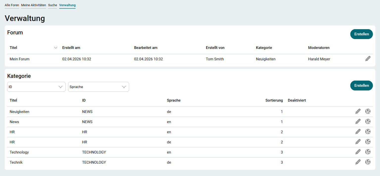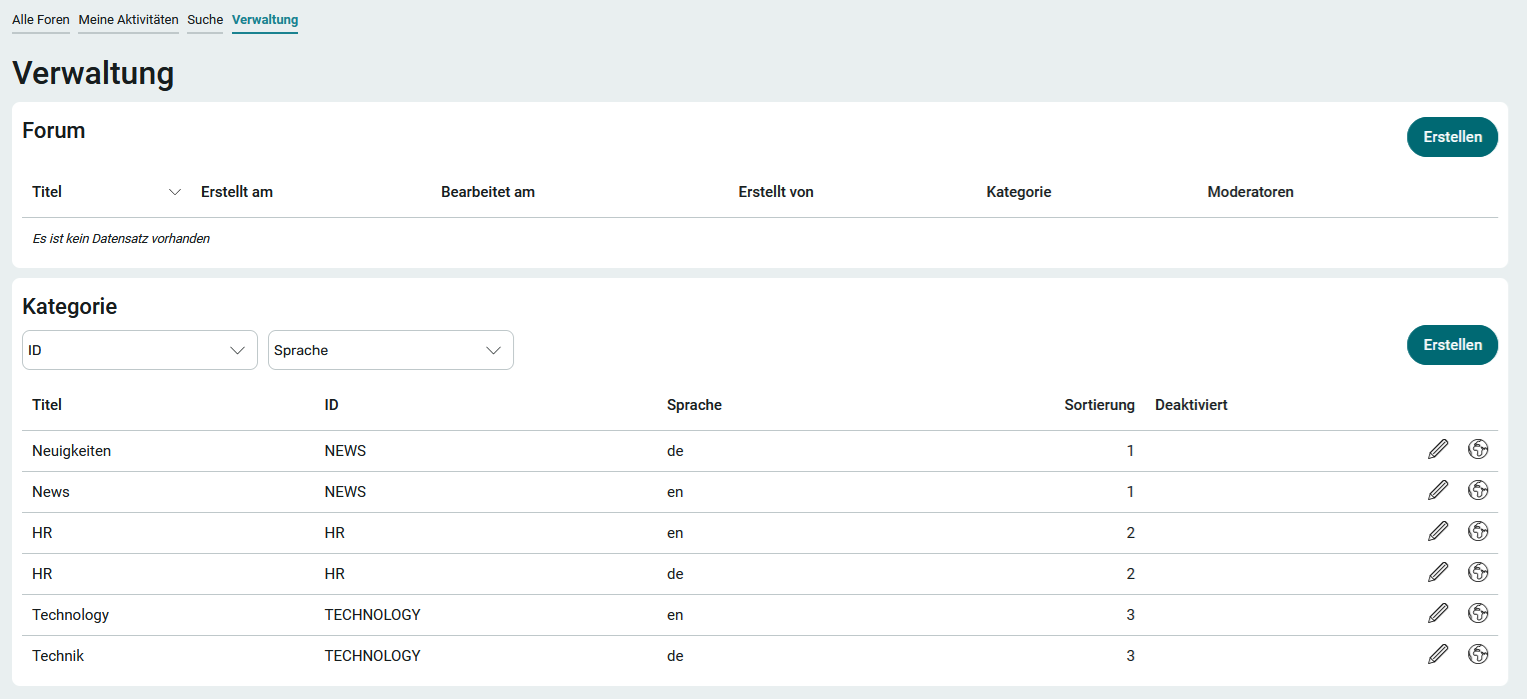 Das Forum ist nun angelegt und wird auf der Seite Verwaltung angezeigt.