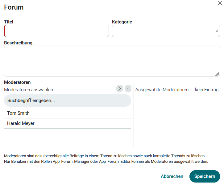 2. Tragen Sie hier die gewünschten Daten ein und bestimmen Sie einen oder mehrere Moderatoren. Moderatoren sind dazu berechtigt Beiträge in einem Thread und auch komplette Threads zu löschen.