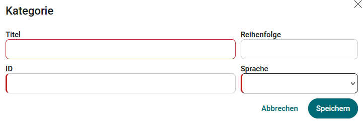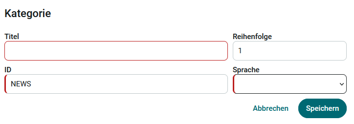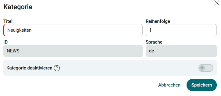 Die ID und Reihenfolge der bestehenden Kategorie ist dann bereits eingetragen. Ergänzen Sie den Titel und wählen Sie die gewünschte Sprache aus. Bei einer Sprachumschaltung im Browser wird die Kategorie dann automatisch in der entsprechenden Sprachvariante angezeigt.