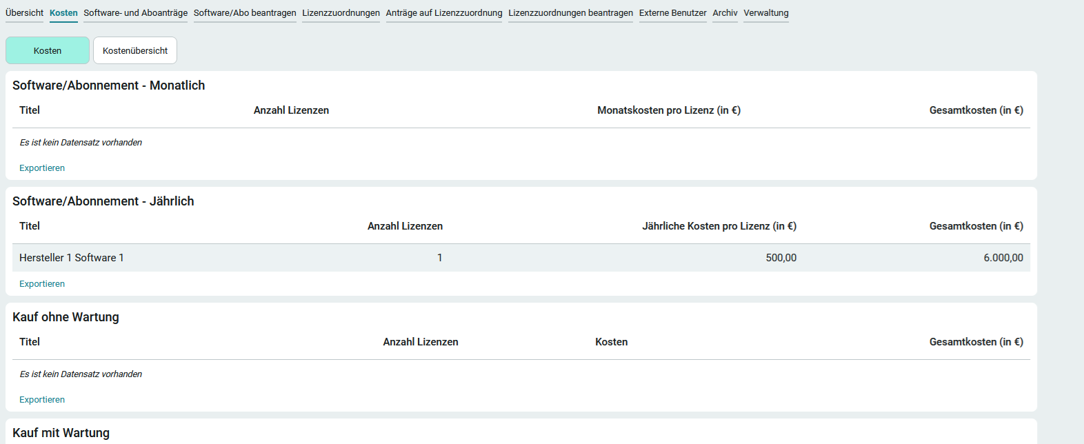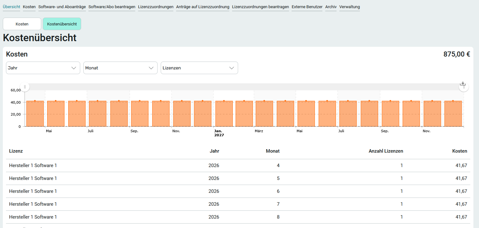 Die Seite Kosten erreichen Sie im Applikationsmenü, wenn Sie Mitglied der Rolle App_LicenseManager_Manager sind. Hier finden Sie eine tabellarische Übersicht über alle Lizenzen.