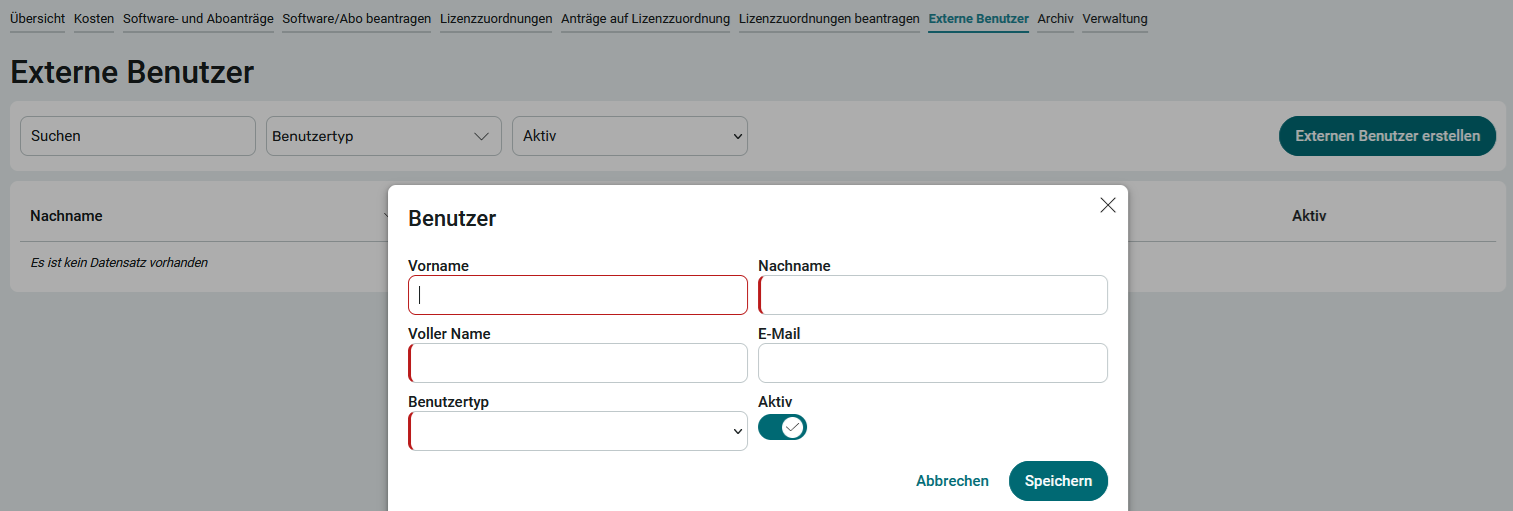 Software kann nicht nur Mitarbeitern, sondern auch externen Benutzern zugeordnet werden. Externe Benutzer werden auf der gleichnamigen Seite angelegt. Die Seite Externe Benutzer erreichen Sie im Applikationsmenü, wenn Sie Mitglied der Rolle App_LicenseManager_Manager sind.