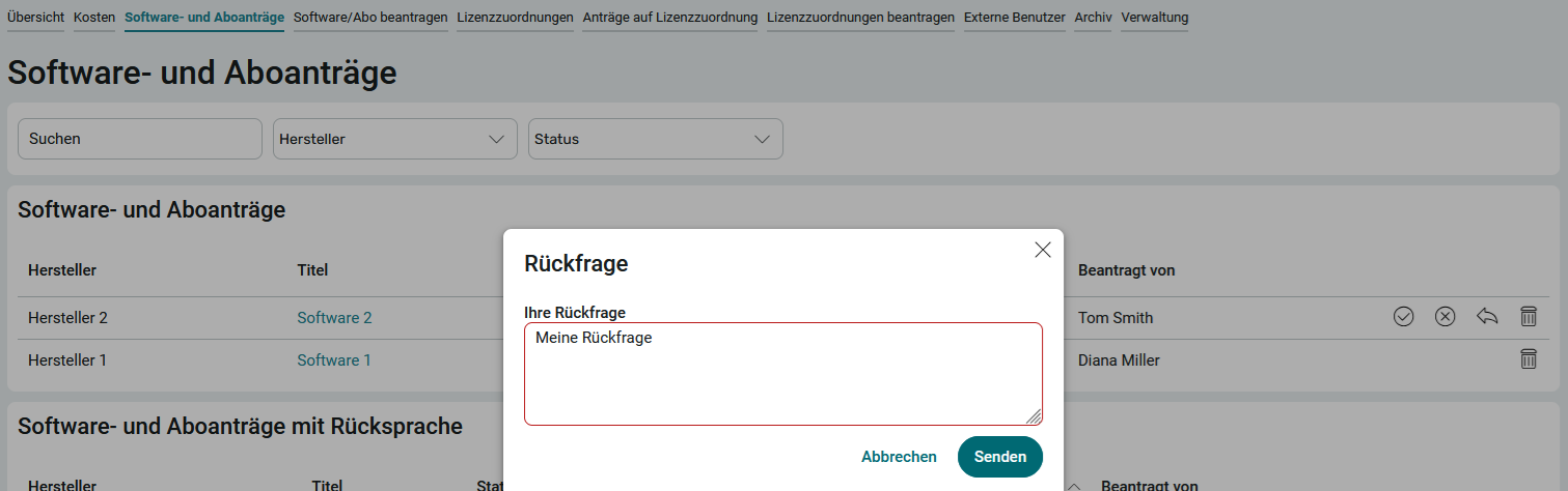 Rückfrage. Auf der folgenden Seite kann die Frage gestellt werden. Nach dem Speichern wird dieser Antrag im Bereich Software- und Aboanträge mit Rücksprache angezeigt.