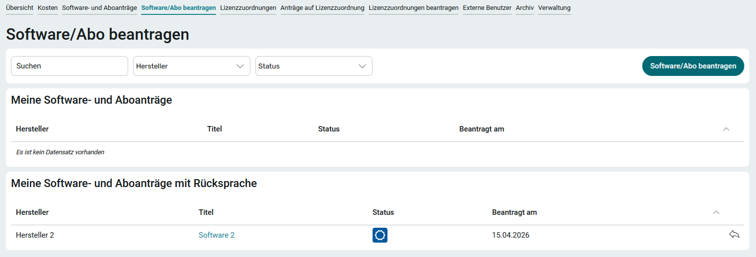 Der Antragsteller sieht diesen Antrag nun auf der Seite Software/Abo beantragen, auf der er auch Anträge erstellen kann, im Bereich Meine Anträge