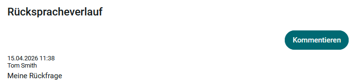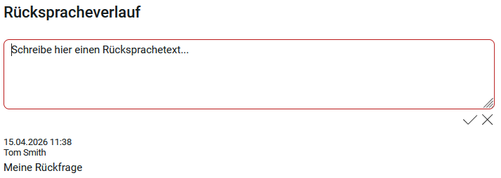 Auf diese Weise kann bezüglich des Antrags bis hin zur Freigabe oder Ablehnung kommuniziert werden. Der Rückspracheverlauf wird dabei entsprechend im unteren Bereich des Dialogs angezeigt.