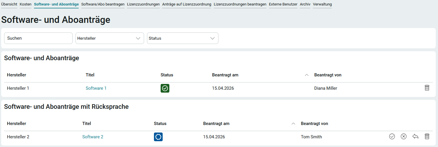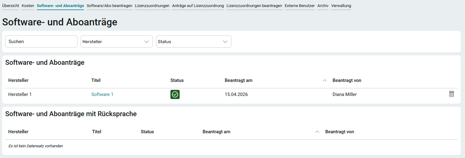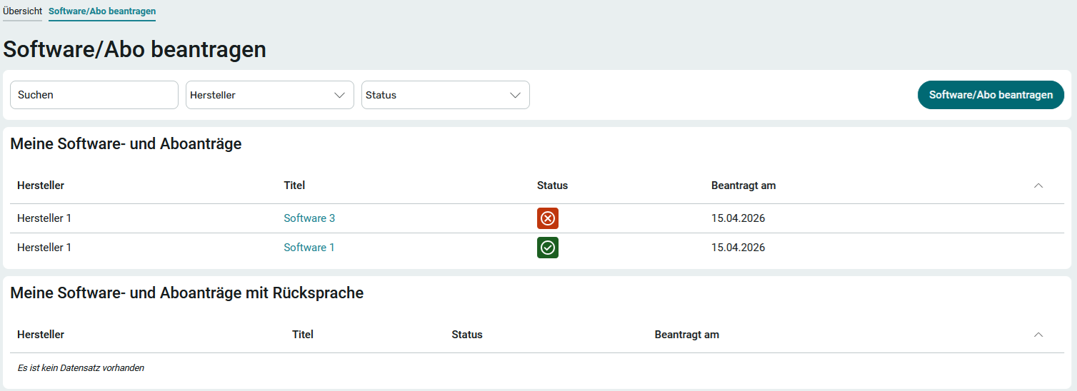 Der Softwareantrag wird nun auf der Seite Software- und Aboanträge mit dem entsprechenden Status angezeigt.
