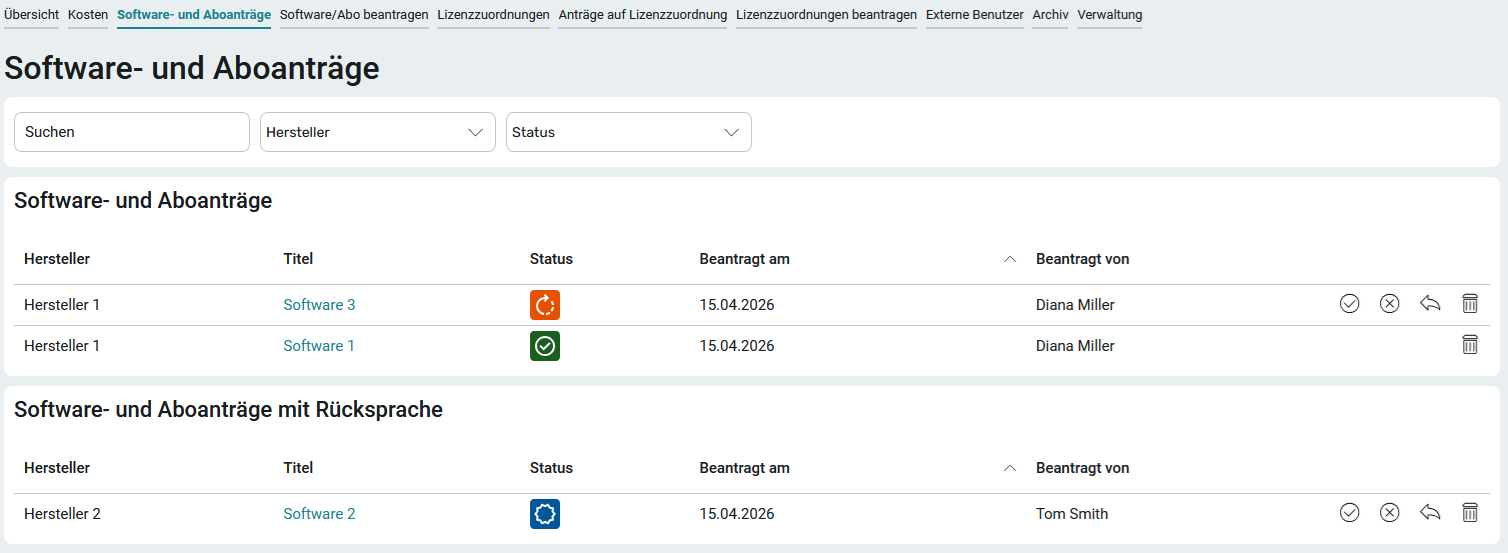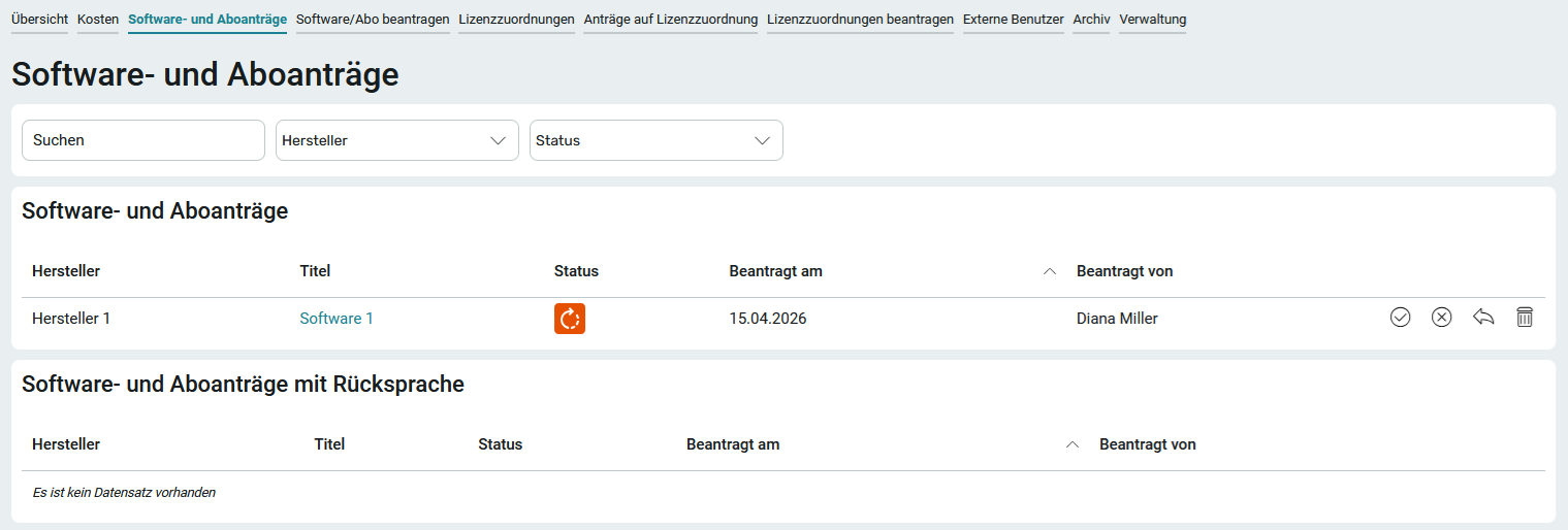 Hat der Antragssteller die Rücksprache erfüllt, so werden im Bereich Software- und Aboanträge mit Rücksprache die Buttons, über die der Status vergeben werden kann , rechts neben dem Eintrag eingeblendet.