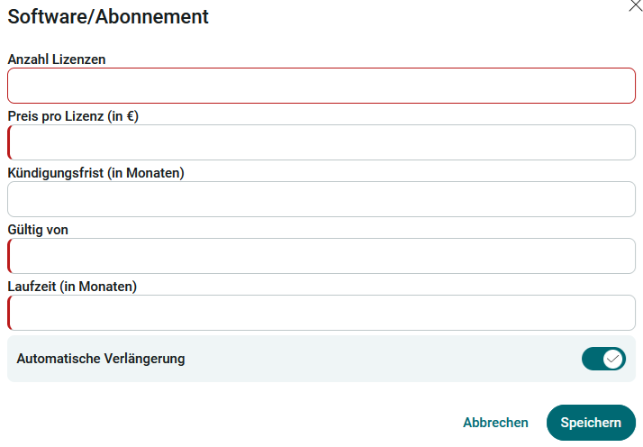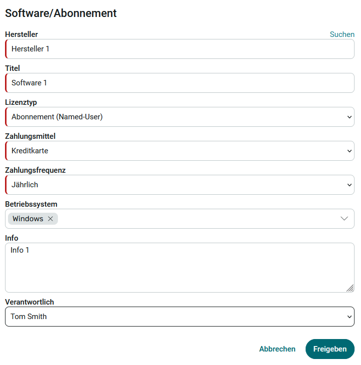 2. Wählen Sie einen Lizenztyp aus und tragen Sie die relevanten Daten ein. Optional kann ein Verantwortlicher ausgewählt werden, z. B. um festzulegen, wer Updates für die Software ausführen darf oder Ansprechpartner für den entsprechenden Mitarbeiter in der IT ist.