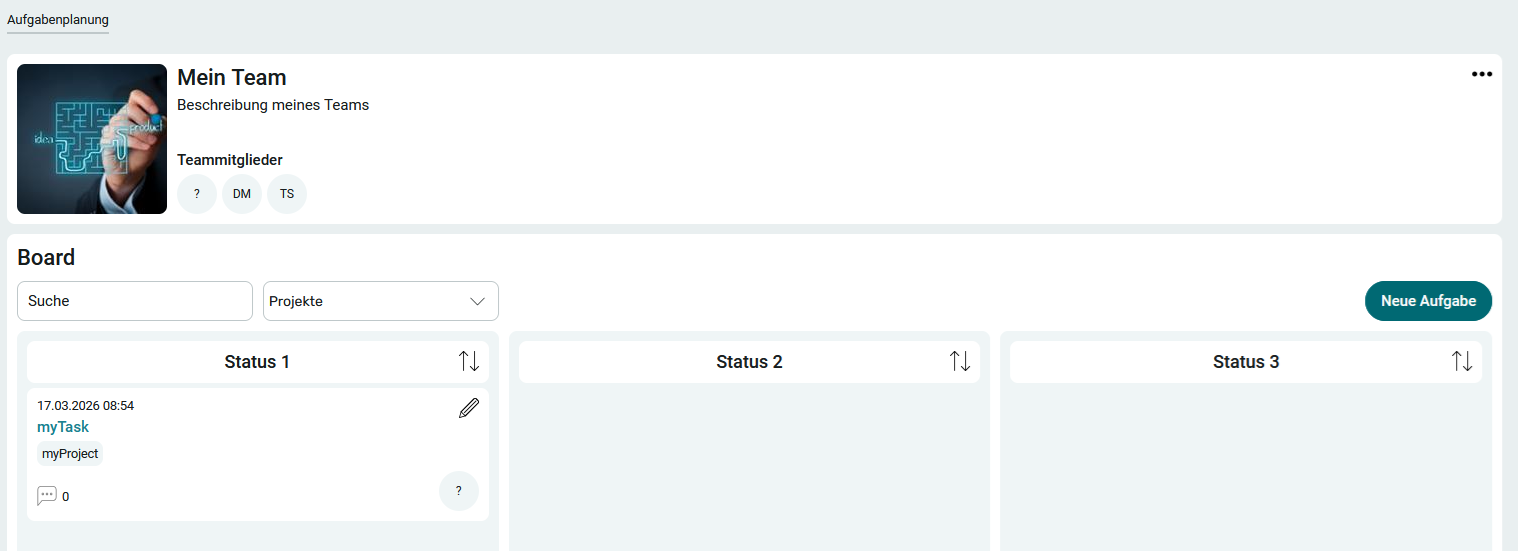 Nach dem Speichern wird die Aufgabe im Team-Board angezeigt. Bei MouseOver wird pro Aufgabe der Button