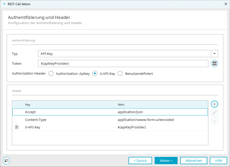Die Authentifizierung werden wir über den API-Key des externen Providers konfigurieren. Wählen Sie den Typ "API-Key" aus der Liste und wählen die Option "X-API-Key".