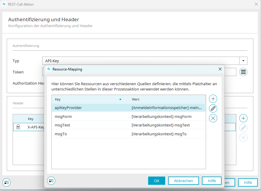 Über das Symbol auf der rechten Seite können Sie auf das Resource-Mapping zugreifen, in dem Sie alle erforderlichen Einträge aus dem Verarbeitungskontext hinterlegt haben.