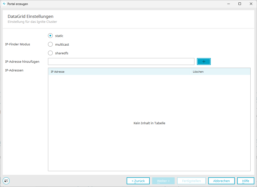Wenn Sie Intrexx als Intrexx Portal Server Produktionsinstallation (Verteilte Cloud/Cluster) installiert haben, gelangen Sie in diesem Schritt der Portalerstellung in die DataGrid Einstellungen.