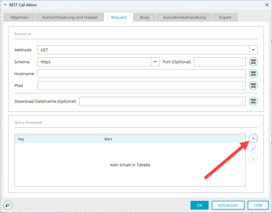 In diesem Schritt müssen Sie Angaben zur API-Ressource machen und die Query-Parameter über Key/Value-Paare erfassen.