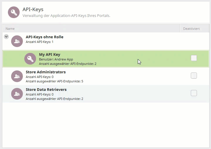 You have the option of assigning API keys to an API role via drag and drop. Once you drag and drop an API key onto an API role, the API key gains access to the API endpoints stored in the API role.